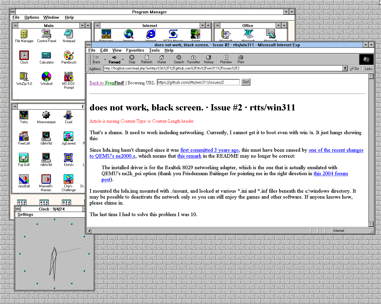 This is mostly an informational PSA for anyone struggling to get Windows 3.11 working in modern versions of QEMU. Yeah, I know, not exactly a massively viral target audience.
